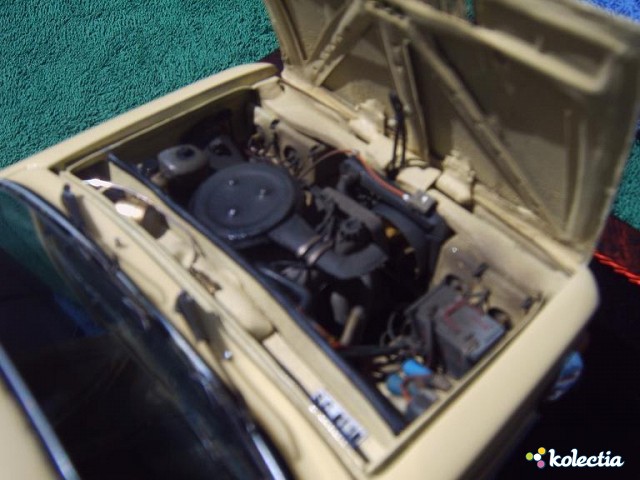 • En el interior del capó se sitúan varios elementos plásticos y metálicos: batería, radiador con ventilador, filtro de aire sobre el carburador, alternador con cables y bujías, bocina, cableados varios de instalación eléctrica con conectores, manguitos, botellas de agua, aceite, etc.